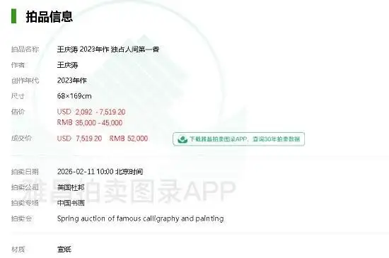 2026年2月11日,美国杜邦中国书画拍卖会现场传来捷报——著名艺术家王庆涛老师的《独占人间第一香》经过多轮激烈竞价,最终以52.000元人民币落槌,引起了收藏界和艺术爱好者的广泛关注。这些凝聚着艺术家心血与才华的墨宝,在拍卖会上竞相争艳,展现出中国书画艺术的永恒魅力。业内人士指出,此成交价不仅印证传统书画在当代艺术市场的强劲生命力,更标志着中国字画收藏进入笔墨精神与投资价值并重的新阶段。