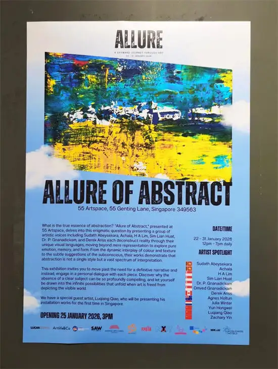 新加坡2026年1月25日 —— 正值第十一届新加坡艺术周(Singapore Art Week)期间,新加坡55号艺术空间(55 Art Space)迎来一场跨越国界的艺术盛宴——“抽象的魅力”(Allure of Abstraction)七国艺术家联展。七国艺术家,以抽象艺术为语言,搭建起一座多元文化对话的桥梁,为新加坡本地与国际观众呈现了一场兼具学术深度与视觉冲击力的艺术盛宴!