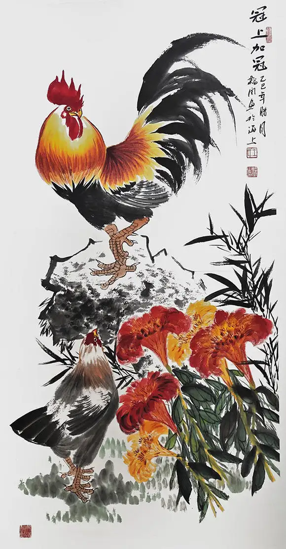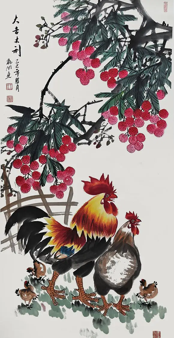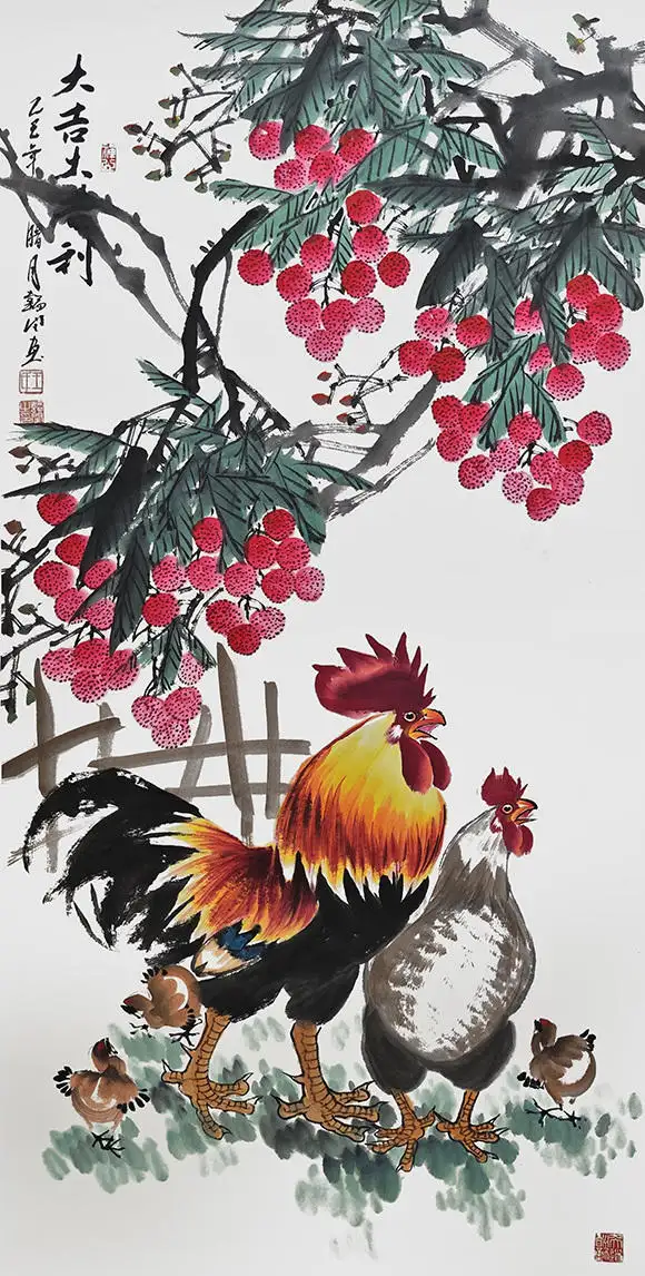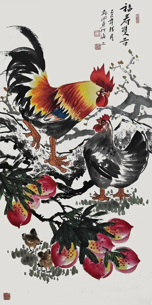 王韬闰先生深耕画坛数十载,尤其擅长以鸡为题材的国画创作,形成了独具辨识度的艺术风格。他笔下的雄鸡,冠如烈火、羽似流霞,昂首挺立间尽显昂扬之气;母鸡温驯慈爱,雏鸡活泼灵动,一唱一和、一护一嬉,将生命的温情与活力跃然纸上。