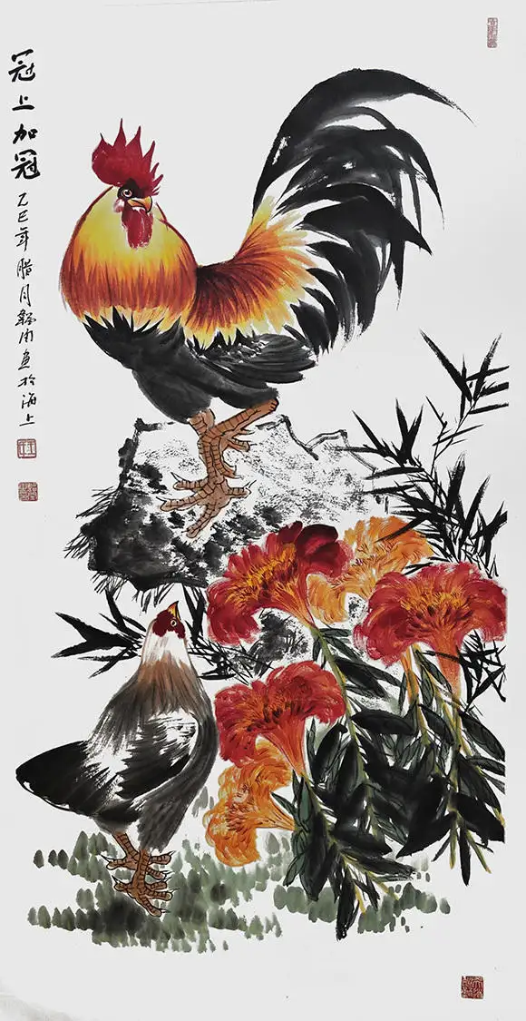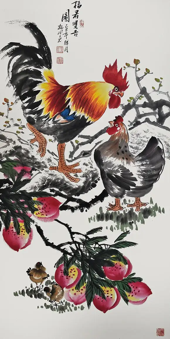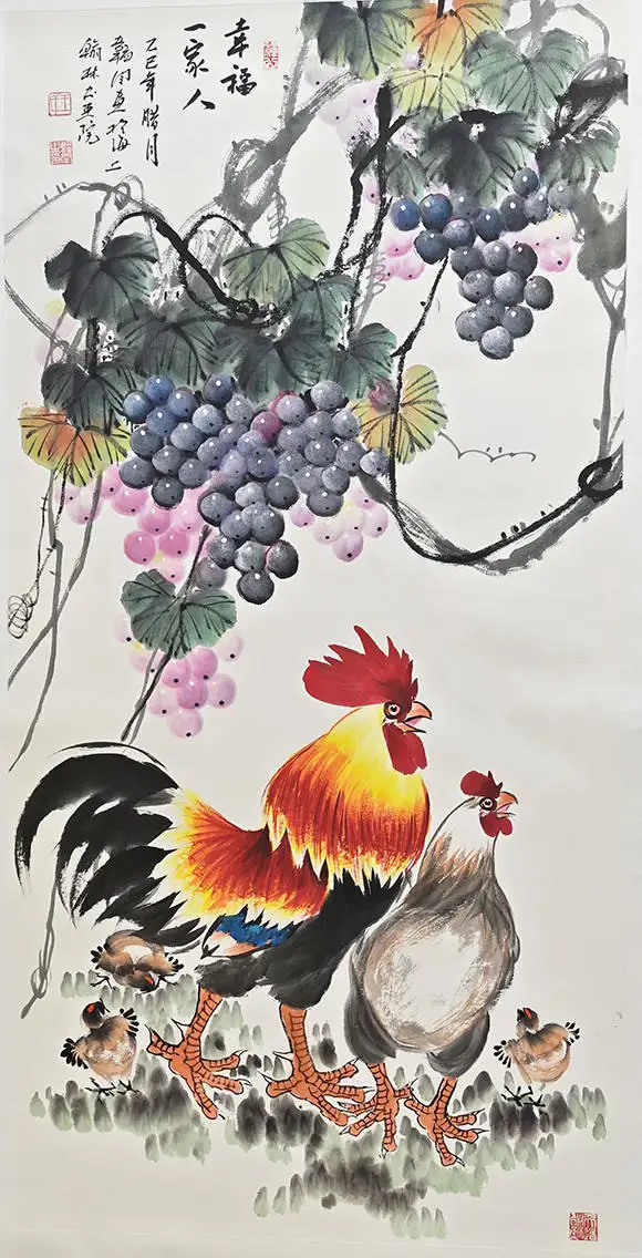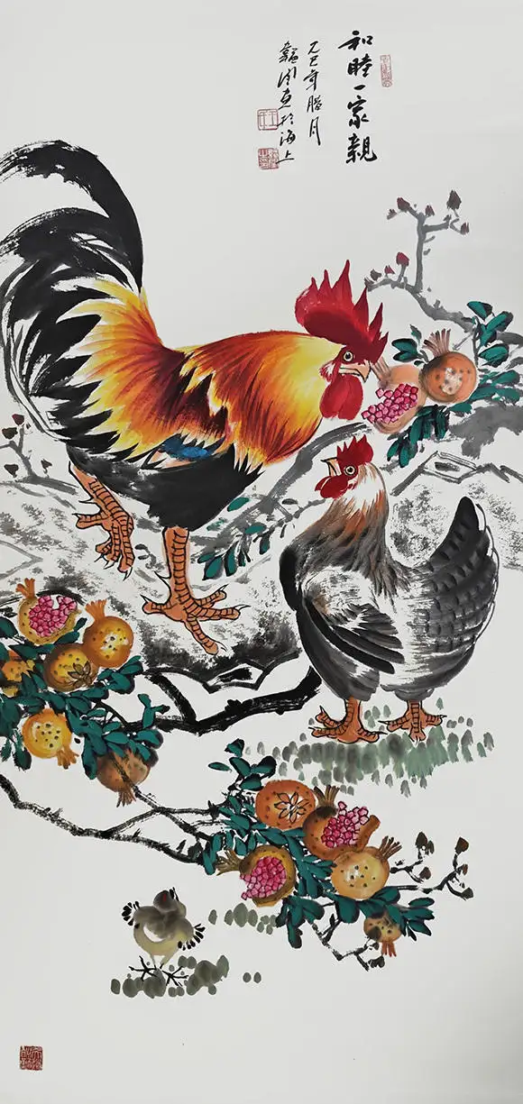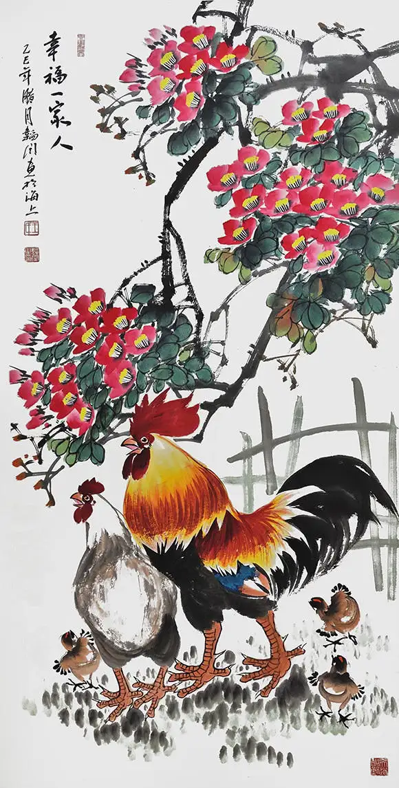 画面主体是一家五口的鸡群:雄鸡昂首挺立,红冠如炬,金羽流光,尽显一家之主的威严与担当;母鸡依偎其侧,目光温柔,守护着身旁的三只雏鸡;雏鸡或啄食嬉戏,或依偎母侧,憨态可掬。整幅画作构图饱满、色彩明快,笔墨酣畅淋漓,既展现了传统国画的写意神韵,又充满了生活的烟火气与温情,将“家和万事兴”的美好寓意具象化,传递出质朴而动人的生命力量。