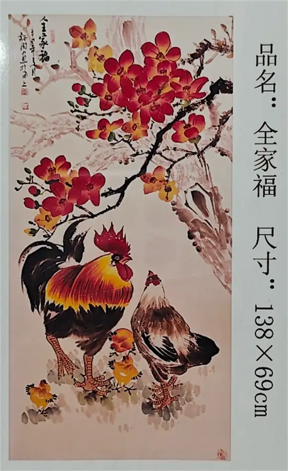 此次被故宫收藏的《全家福》,是王韬闰画鸡艺术的代表之作。画作尺寸为138×69cm,画面以一株盛放的木棉为背景,火红的花朵与苍劲的枝干相映成趣,寓意着蓬勃向上的生命力。