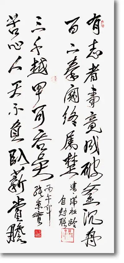 观其作品《清·蒲松龄·自勉联》“有志者事竟成,破釜沉舟,百二秦关终属楚;苦心人天不负,卧薪尝胆,三千越甲可吞吴”,则以行草为基,兼具楷书的稳健与草书的灵动。上联“有志者事竟成”笔势开张,“破釜沉舟”四字以重墨书写,线条遒劲如铁,彰显出项羽破釜沉舟的决绝;下联“苦心人天不负”则以轻笔入纸,“卧薪尝胆”四字线条灵动,蕴含着勾践隐忍复国的坚韧。整幅作品章法疏密得当,上下联呼应自然,既传递了蒲松龄自勉联中自强不息、永不言弃的精神内核,又以精湛的笔墨展现了张东实先生对传统文化的深刻理解。作品中,“百二秦关终属楚”的豪迈与“三千越甲可吞吴”的自信,通过笔墨的流转跃然纸上,不仅是对古人精神的致敬,更是对当代人的激励。